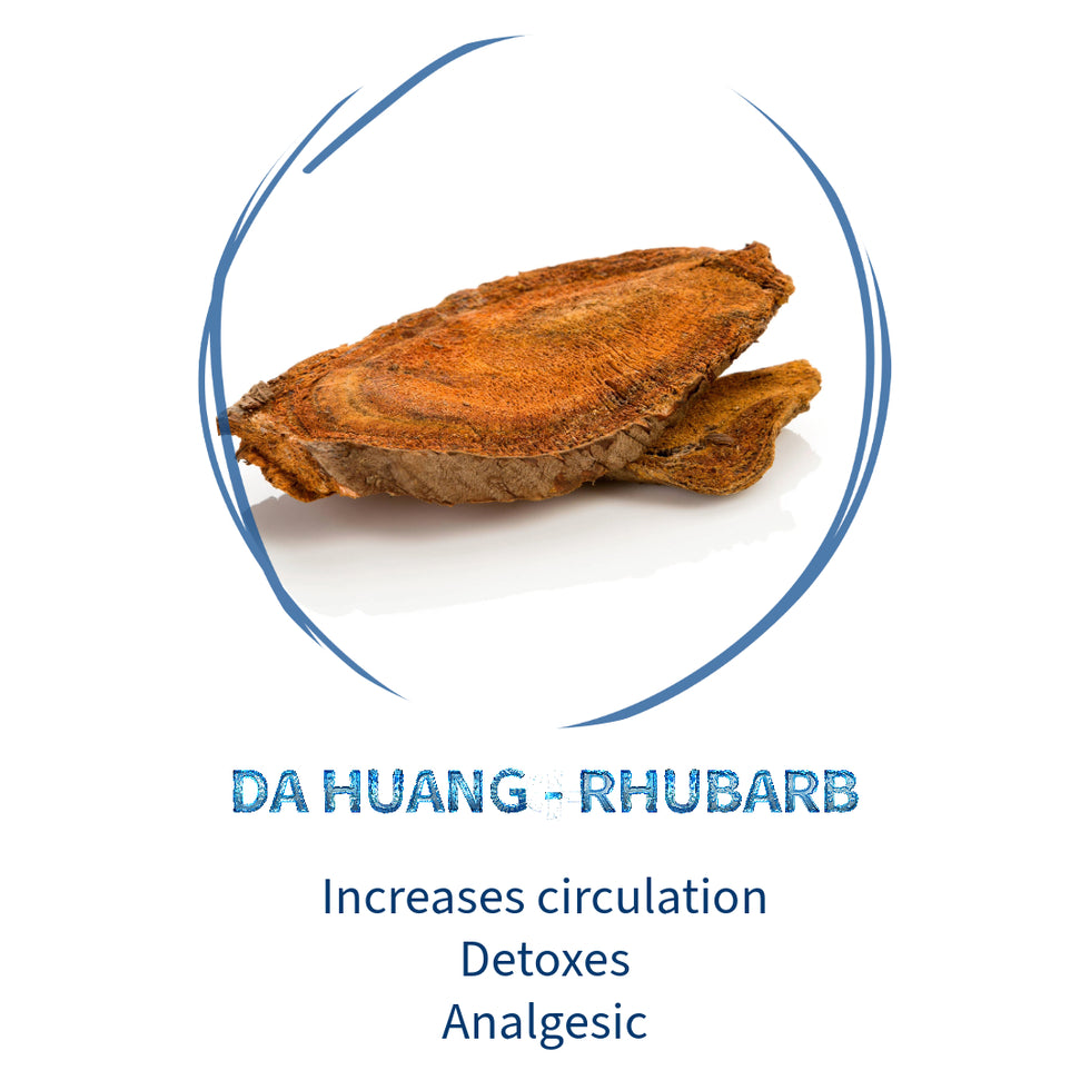 Rhubarb (Da Huang): Known for clearing heat and moving blood, it helps break up stagnation and relieve inflammation.