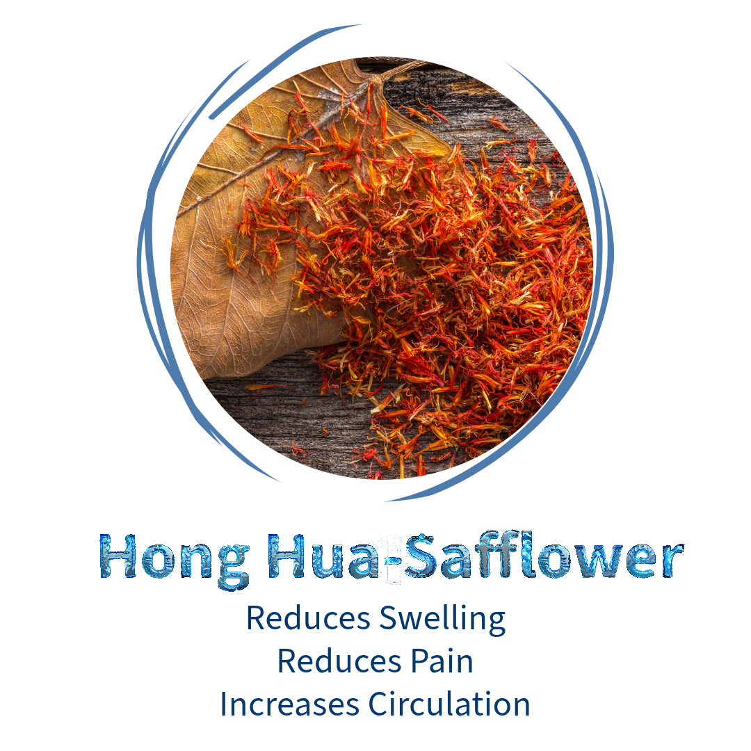 Safflower (Hong Hua): Invigorates circulation and relieves pain from bruises, sprains, and chronic stiffness.