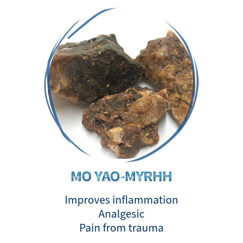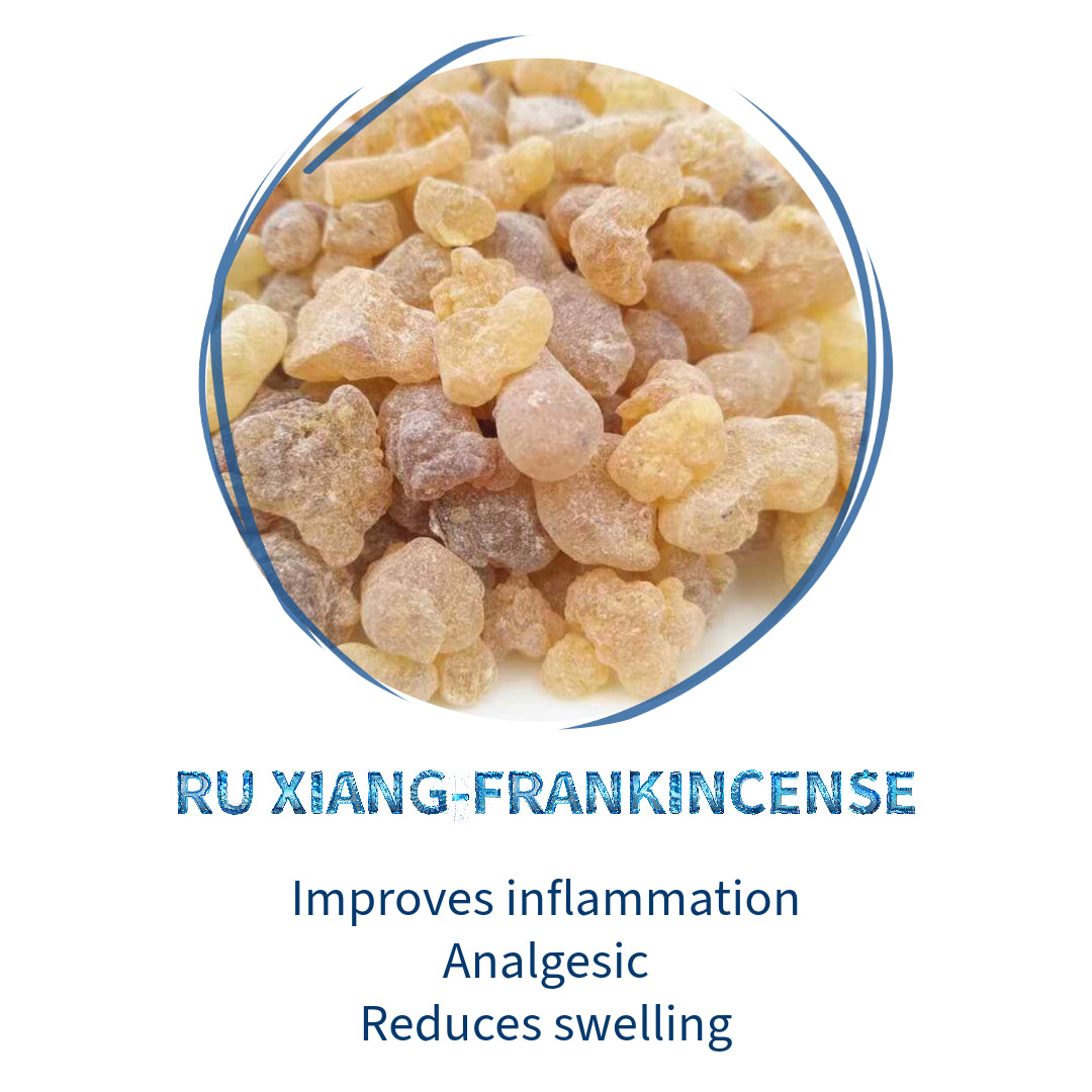 Myrrh (Mo Yao): Promotes blood circulation and is used to relieve swelling, stiffness, and trauma pain.